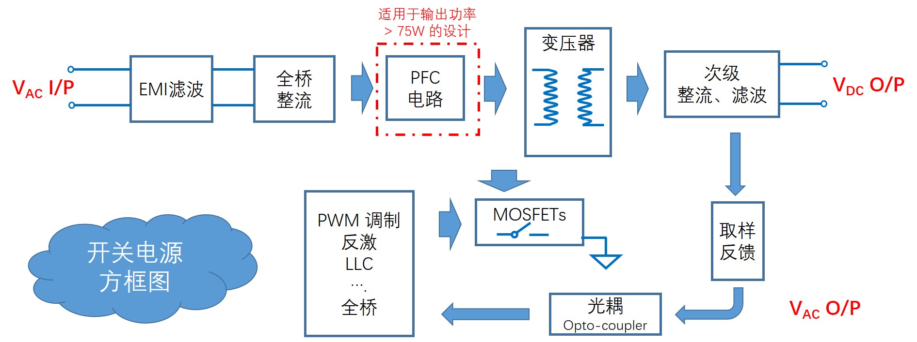 開(kāi)關(guān)電源主要由防浪涌電路、電磁干擾濾波電路(EMI)、初級(jí)整流濾波電路、功率因數(shù)校正電路(PFC)、PWM 控制電路、功率轉(zhuǎn)換電路、輸出整流濾波電路、取樣反饋電路和保護(hù)電路等組成。