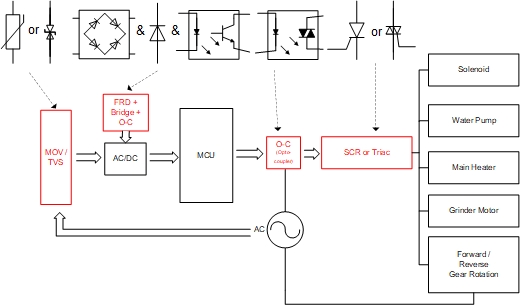 人們把電子技術(shù)應(yīng)用到咖啡機(jī)上,實(shí)現(xiàn)了磨粉、壓粉、裝粉、沖泡、清除殘?jiān)柔勚瓶Х热^程的自動控制,創(chuàng)造了全自動電子咖啡機(jī)。 應(yīng)用于消費(fèi)電子領(lǐng)域,捷捷微電 能提供比較齊全的元件解決方案。比如:AC 輸入端防浪涌的壓敏電阻(MOV)、電源部分用快恢復(fù)二極管(FRD, fast recovery diode)及整流橋(Bridge)、光電隔離器件(Opto-coupler)、控制負(fù)載通斷的可控硅(SCR & Triac)等。